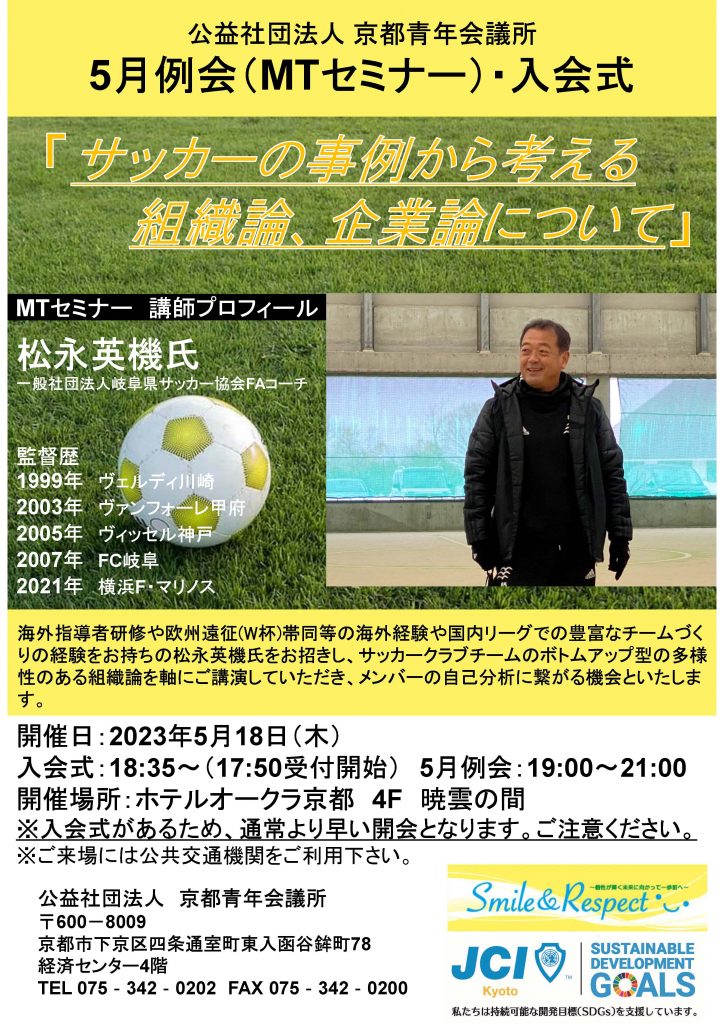 本例会は講師に岐阜県サッカー協会 FA コーチ松永英機氏をお迎えし 「サッカーの事例から考える組織論、企業論について」をテーマにご講演していただきます。