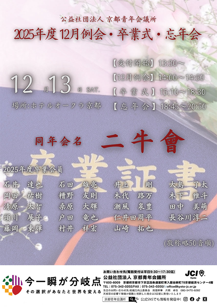 時間:受付開始13:30〜、12月例会14:00〜14:50、卒業式15:10〜18:30、忘年会18:45〜20:50