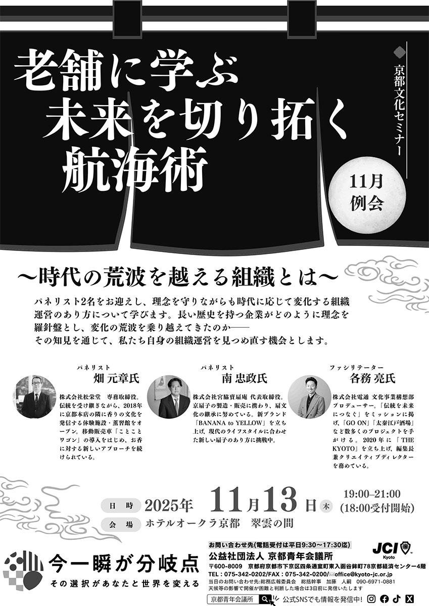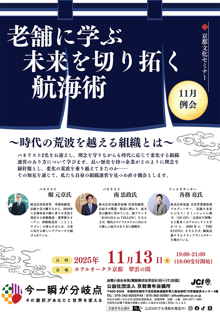 TOP 私たちの活動・事業紹介 11月例会「老舗に学ぶ未来を切り拓く航海術」 INFORMATION事業・例会 2025.10.26 11月例会「老舗に学ぶ未来を切り拓く航海術」 日程:2025年11月13日(木) 時間:19:00〜21:00(受付開始 18:00) 場所:ホテルオークラ京都 翠雲の間(〒604-8558 京都府京都市中京区 河原町御池) 一覧へ戻る 最近の記事 2025.10.26 11月交流会のご案内 2025.10.26 11月例会「老舗に学ぶ未来を切り拓く航海術」 2025.10.15 10月例会「リーダーとして行動するために」 カテゴリー お知らせその他交流会例会 過去の投稿 月を選択 2025年10月 (3) 2025年8月 (2) 2025年7月 (2) 2025年6月 (3) 2025年5月 (1) 2025年4月 (2) 2025年3月 (2) 2025年2月 (2) 2025年1月 (3)
