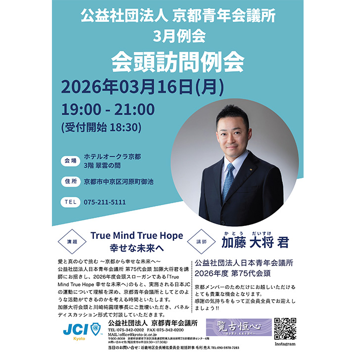 TOP 私たちの活動・事業紹介 例会 INFORMATION事業・例会 例会 2026.03.10 4月例会「花街が伝える『最高の人脈作り』」 例会 2026.03.10 3月例会「会頭訪問例会」 例会 2026.02.27 3月例会「政治参画意識向上につながる例会」 例会 2026.01.07 1月例会・新春交歓会のご案内 例会 最近の記事 2026.03.10 4月例会「花街が伝える『最高の人脈作り』」 2026.03.10 3月例会「会頭訪問例会」 2026.02.27 3月例会「政治参画意識向上につながる例会」 カテゴリー 交流会例会 過去の投稿 月を選択 2026年3月 (2) 2026年2月 (2) 2026年1月 (2) 事業・例会INFORMATION 京都会議MEETING 委員会紹介コンテンツINTRODUCTION 広告企業様一覧ADVERTISING COMPANY 広告募集ADVERTISEMENT