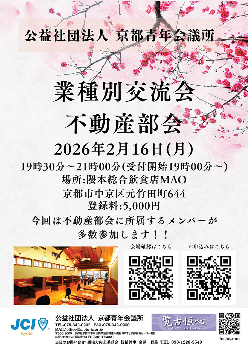 TOP 私たちの活動・事業紹介 2月交流会のご案内 INFORMATION事業・例会 2026.01.28 2月交流会のご案内 日時:2026年2月16日(日)19:30~21:00(受付開始 19:00) 会場:隈本総合飲食店MAO(〒604-8145 京都府京都市中京区元竹田町644) 登録料:5,000円(税込) お申し込みはこちら 一覧へ戻る 最近の記事 2026.01.28 2月交流会のご案内 2026.01.07 1月例会・新春交歓会のご案内 カテゴリー 交流会例会 過去の投稿 月を選択 2026年1月 (2) 事業・例会INFORMATION 京都会議MEETING 委員会紹介コンテンツINTRODUCTION 広告企業様一覧ADVERTISING COMPANY 広告募集ADVERTISEMENT